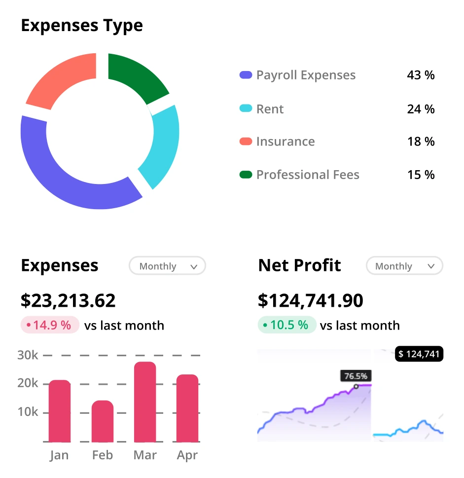 We provide in-house financial analytics, reporting, and insights, with creative dashboards you can use to visualize your business performance over the months. This gets you more control over your business and how you spend your money.